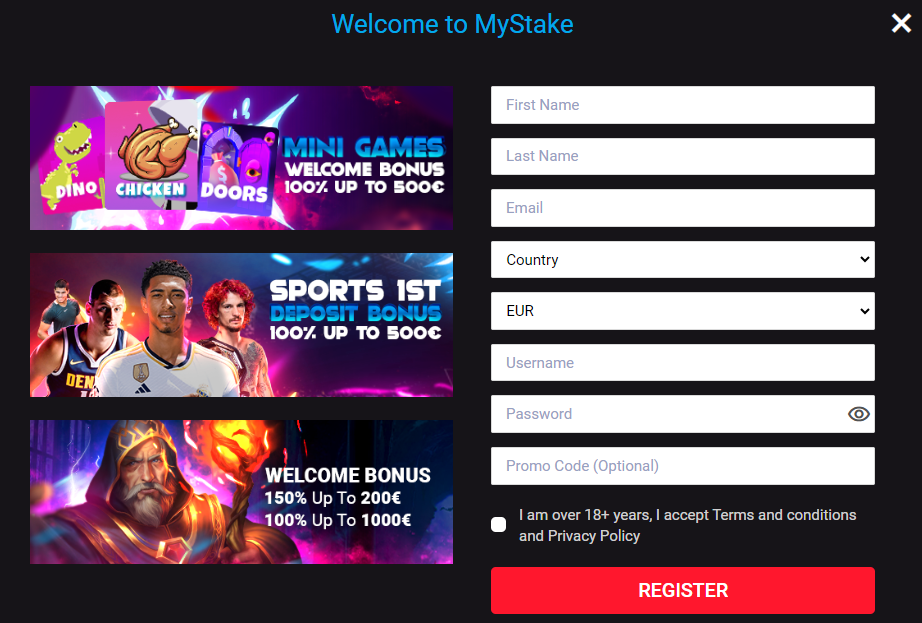 First of all, to have access to the free live streams of the greyhound tournaments around the world, you must be registered with our partners, MyStake Casino. They have the simplest registration form that will not take more than a minute. Take a look at all the required fields they have.