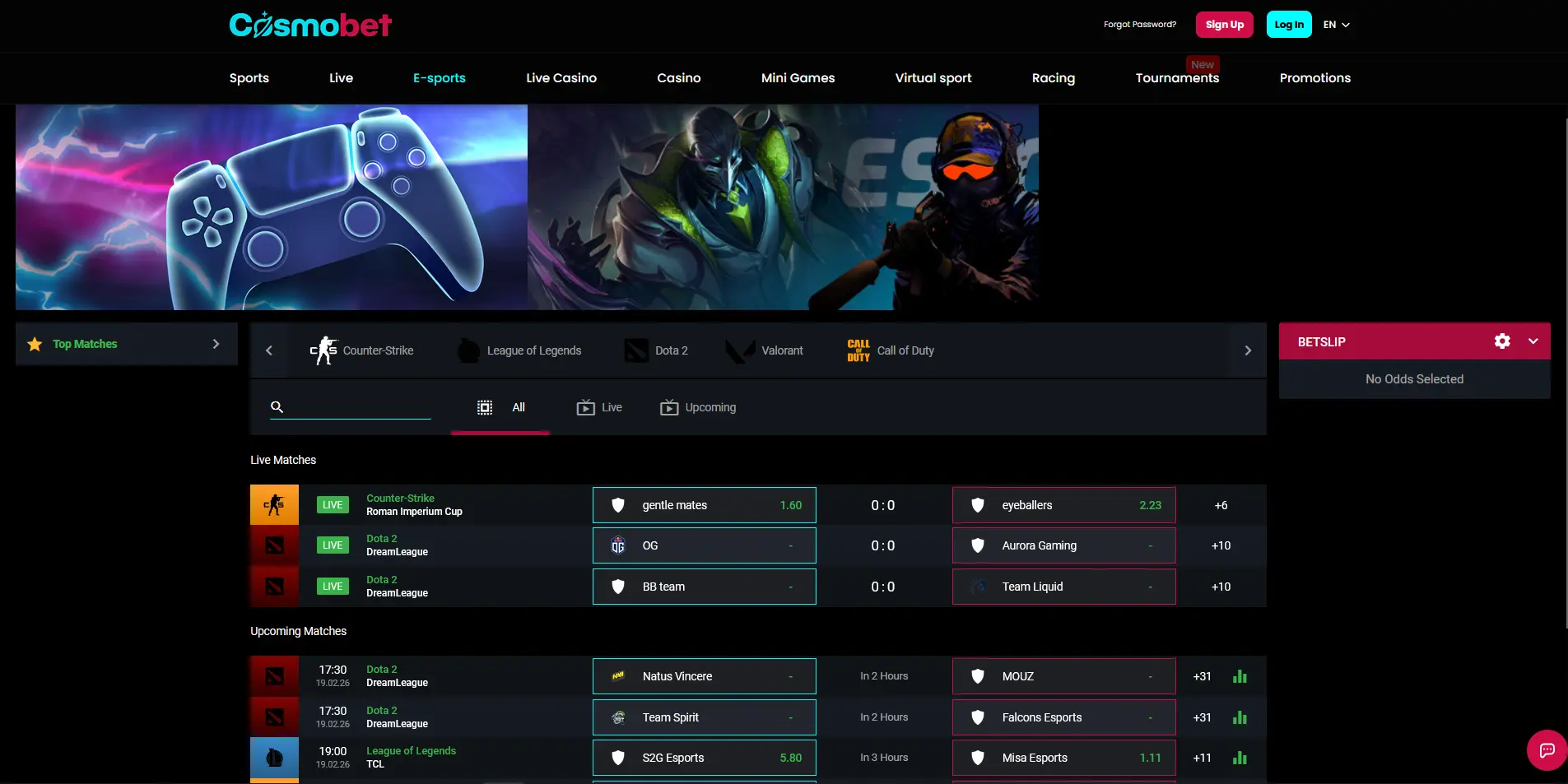 The live betting feature is available for only a few sports, including soccer, tennis, basketball, ice hockey, volleyball, table tennis, darts, and esports (Counter-Strike and Dota 2). Despite coverage limitations, Cosmobet offers live streaming and the match tracker on popular matches.