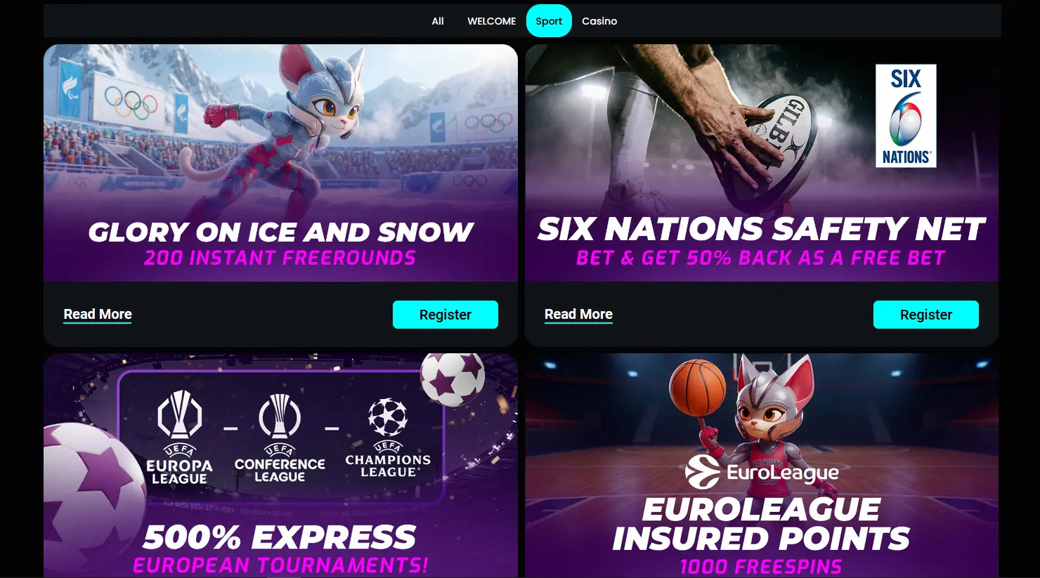 - EuroLeague Group Stage: You receive up to 1,000 Free Spins when your bet is lost when betting on EuroLeague basketball. To qualify, you must deposit at least £20 with a minimum of 2 selections and odds of 1.60 or more. If you lose your bet, you receive 50% Free Spins (value $0.50 each) on the game “5x Magic” by Play’n GO.