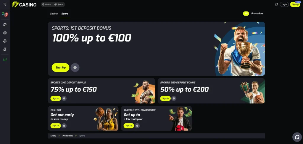 - Multiply With Comboboost – After players make a multiple bet across at least 4 events with odds of 1.30, F7 Casino will add a multiplier to all their winnings. The multiplier increases with more bets placed, up to 1.5x for 16 or more bets at once.