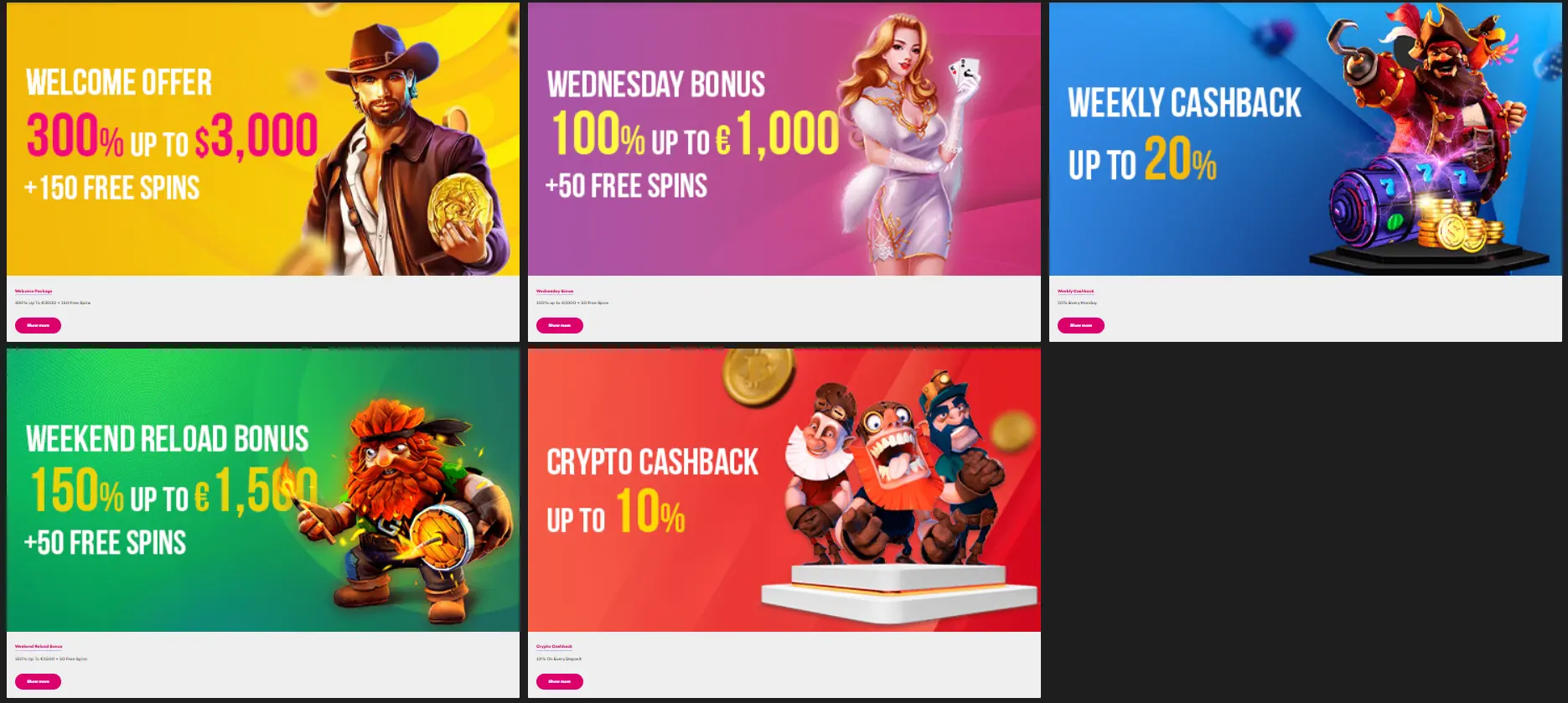 Weekly Cashback – Up to 20% cashback credited every Monday. This is typically based on deposits or losses from the previous Monday to Sunday period. Minimum bonus amount is €20. The maximum bonus amount is unlimited. The limit for the maximum bet during wagering is €50 or equivalent in other currencies.