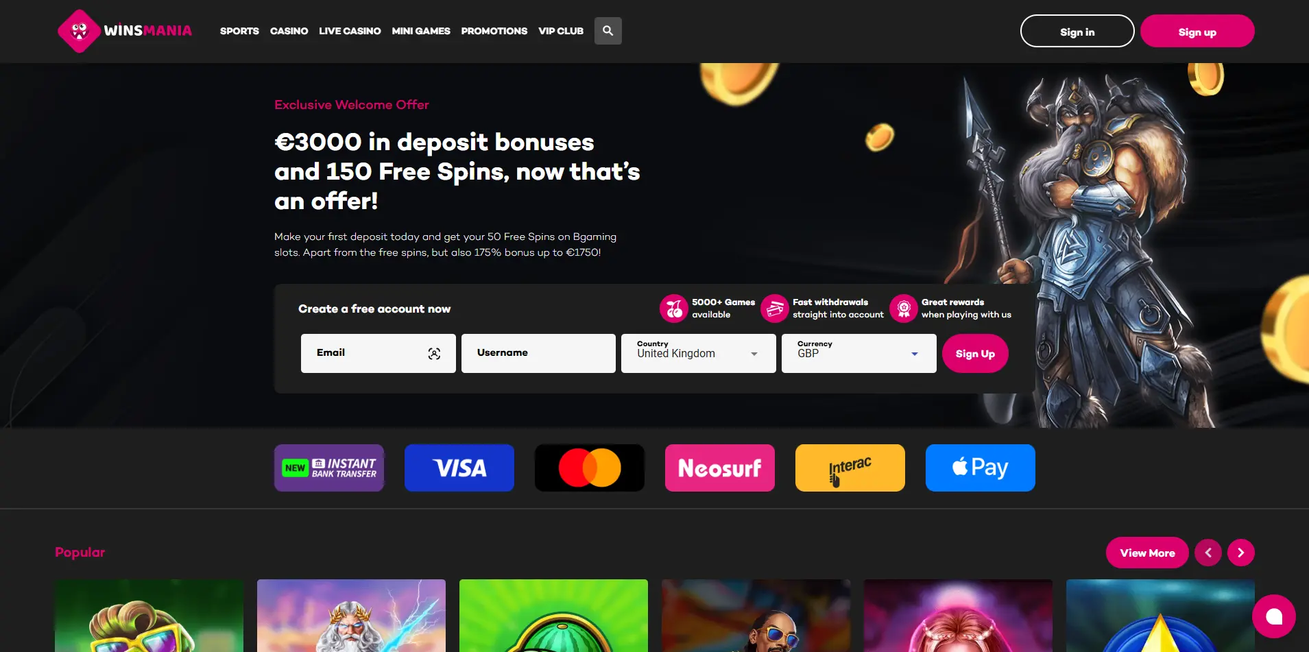 WinsMania lists cards (Visa/Mastercard) plus PayPal, Skrill, Neteller, and bank transfer. The site states card and e-wallet deposits are instant, while bank transfers can take 1–3 business days, depending on your bank.