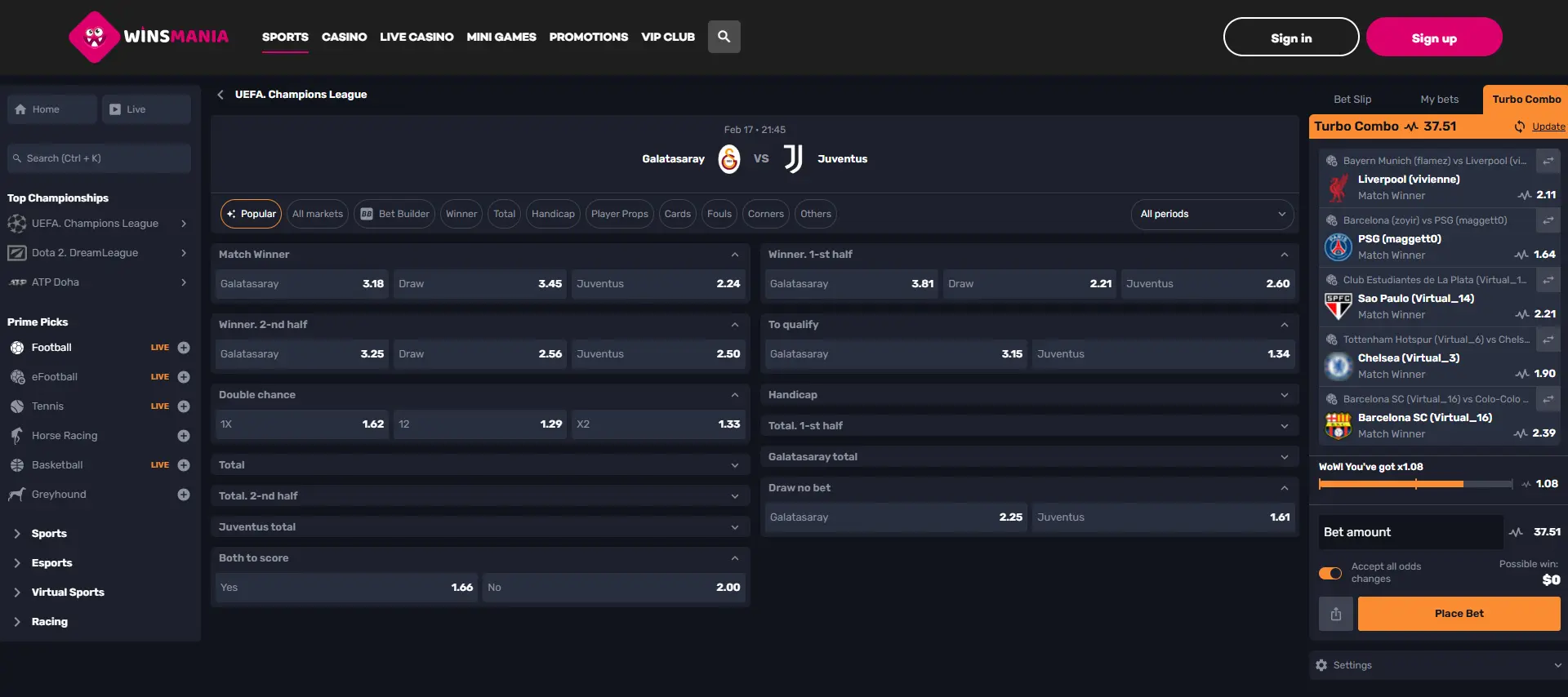 Popular betting options at WinsMania can be divided into 4 major categories. Have a look at the market depth, just from a single Champions League match between Galatasaray and Juventus.