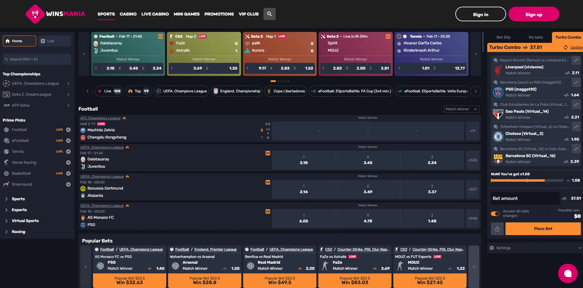 WinsMania odds are given in European format, but if you prefer any other format, you can easily change it from the bottom of the website. There are three types of bets available at the website: Single Bet, Combo bet and Turbo Bet. Placing a single bet is the simplest of the three; it means you are wagering on just one outcome of the game.