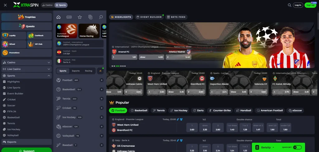 The sports betting is diverse on XtraSpin. You can bet on mainstream sports like Football, Basketball, and Tennis, races like horses and greyhounds, as well as on Esports like Counter-Strike 2 or Valorant. Live betting is available for some games in certain regions.